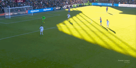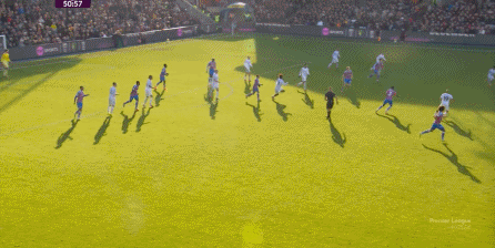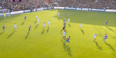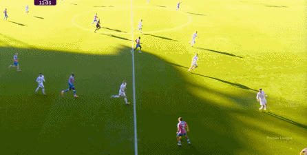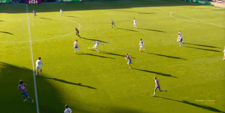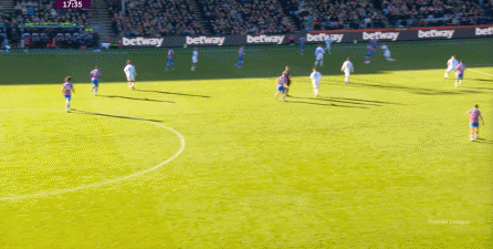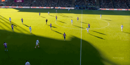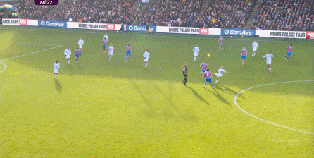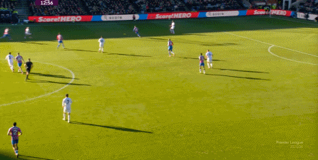 在這樣截然不同的支點(diǎn)效果之下,兩支球隊(duì)的進(jìn)攻自然也呈現(xiàn)出了完全不同的樣子,比如在第12分鐘,水晶宮就打出了一次非常流暢和輕松的轉(zhuǎn)移進(jìn)攻,帶出了左側(cè)的傳中: