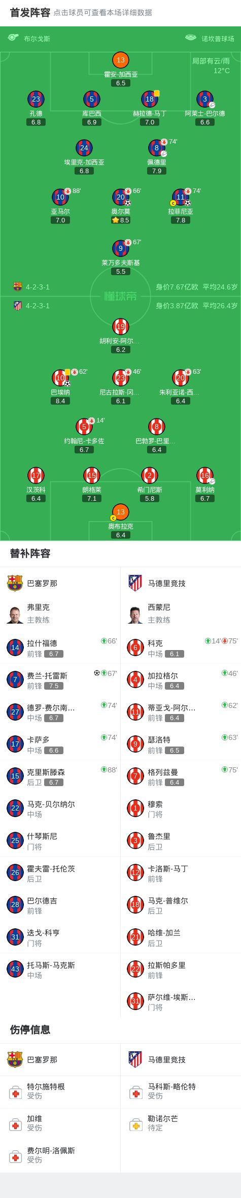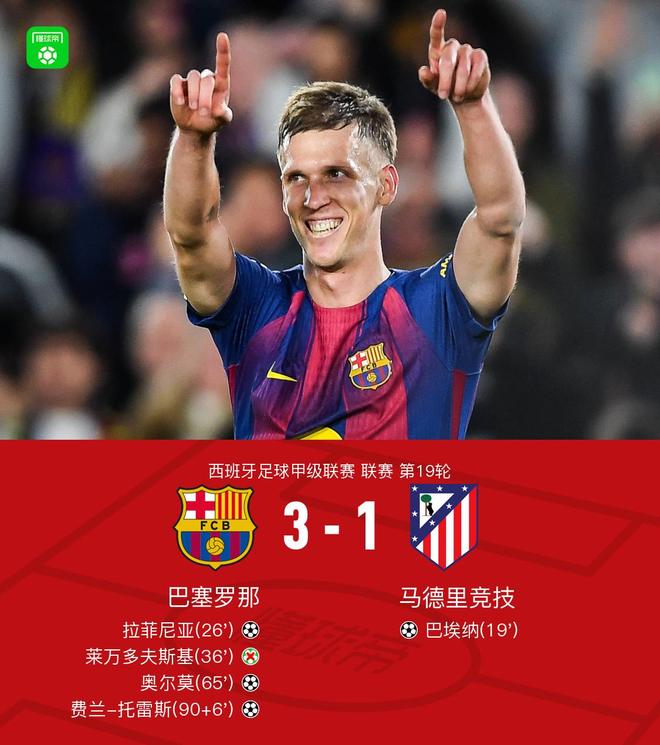 北京時(shí)間12月3日4:00,西甲第19輪焦點(diǎn)戰(zhàn),巴塞羅那坐鎮(zhèn)Spotify諾坎普球場迎戰(zhàn)馬德里競技,本場主裁判為布爾戈斯。上半場,莫利納助攻巴埃納反越位單刀破門首開記錄,佩德里手術(shù)刀直塞助攻拉菲尼亞扳平比分,隨后奧爾莫造點(diǎn),萊萬主罰點(diǎn)球踢飛。下半場,奧爾莫建功,費(fèi)蘭-托雷斯鎖定勝局。最終,巴薩主場3-1逆轉(zhuǎn)馬競。