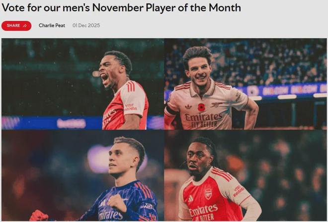 官方:阿森納宣布廷貝爾、賴斯、特羅薩德和埃澤被提名為了11月隊內(nèi)最佳候選。