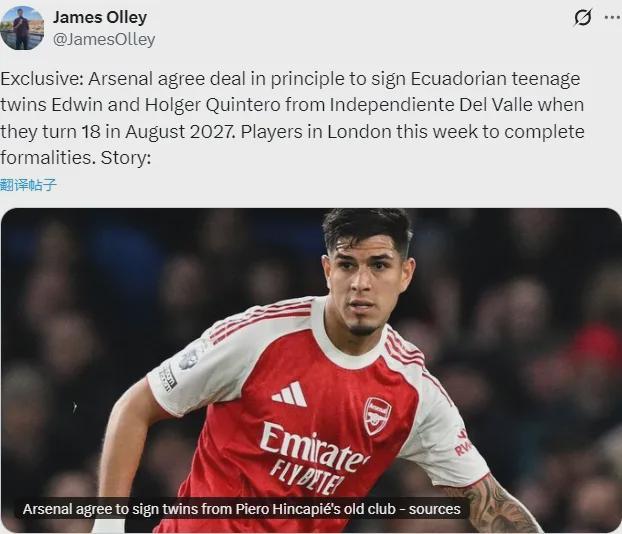 ESPN記者JO消息,阿森納已經(jīng)就2027年夏天(年滿18周歲時)從山谷獨立俱樂部收購雙胞胎兄弟埃德溫-金特羅和霍爾格-金特羅達成了原則性協(xié)議。