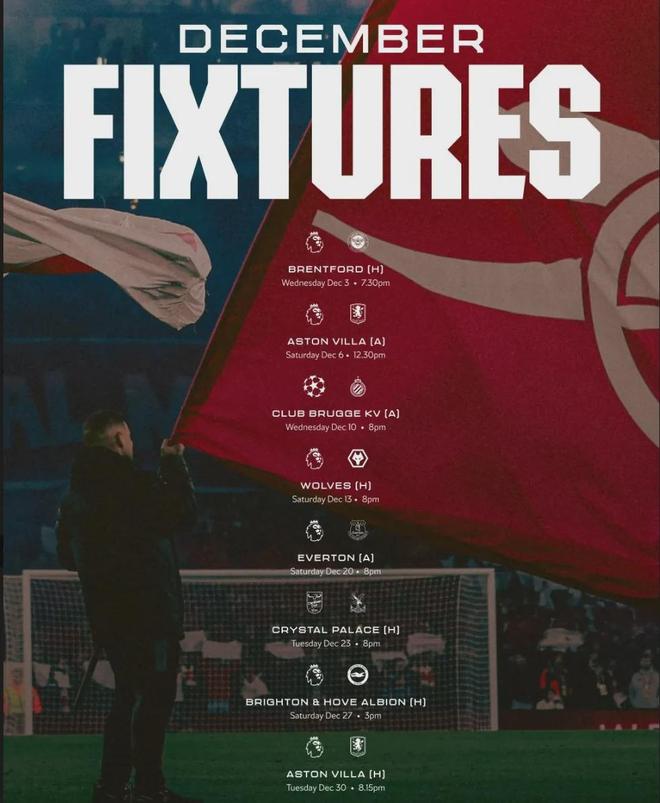 阿森納12月賽程:主戰(zhàn)布倫特福德、客戰(zhàn)維拉、客戰(zhàn)布魯日、主戰(zhàn)狼隊、客戰(zhàn)埃弗頓、主戰(zhàn)水晶宮(聯(lián)賽杯)、主戰(zhàn)布萊頓、主戰(zhàn)維拉。