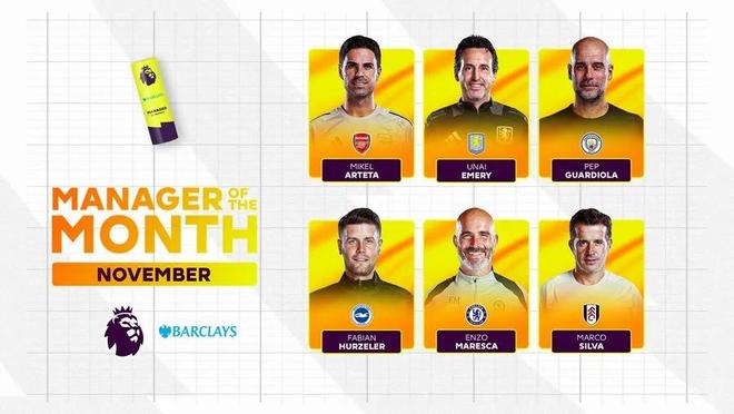 英超官方公布了11月最佳主教練候選名單,馬雷斯卡、瓜迪奧拉、阿爾特塔、埃梅里等人在列。
